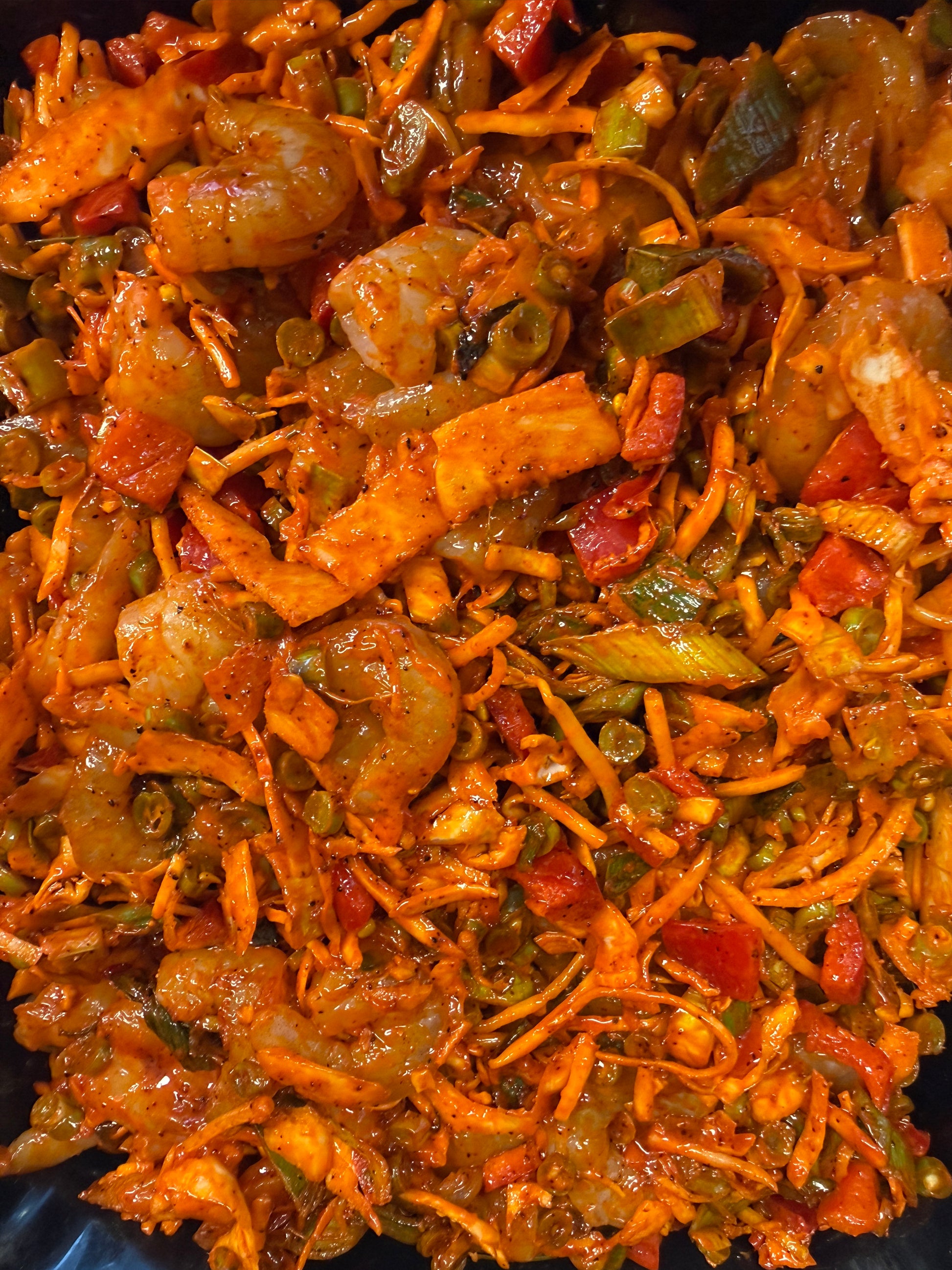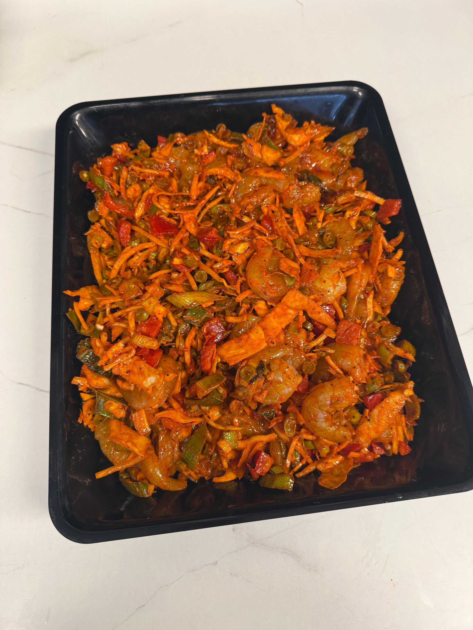 Met groente, tijger garnalen en pittige marinade. €2,95 per 100 gram.