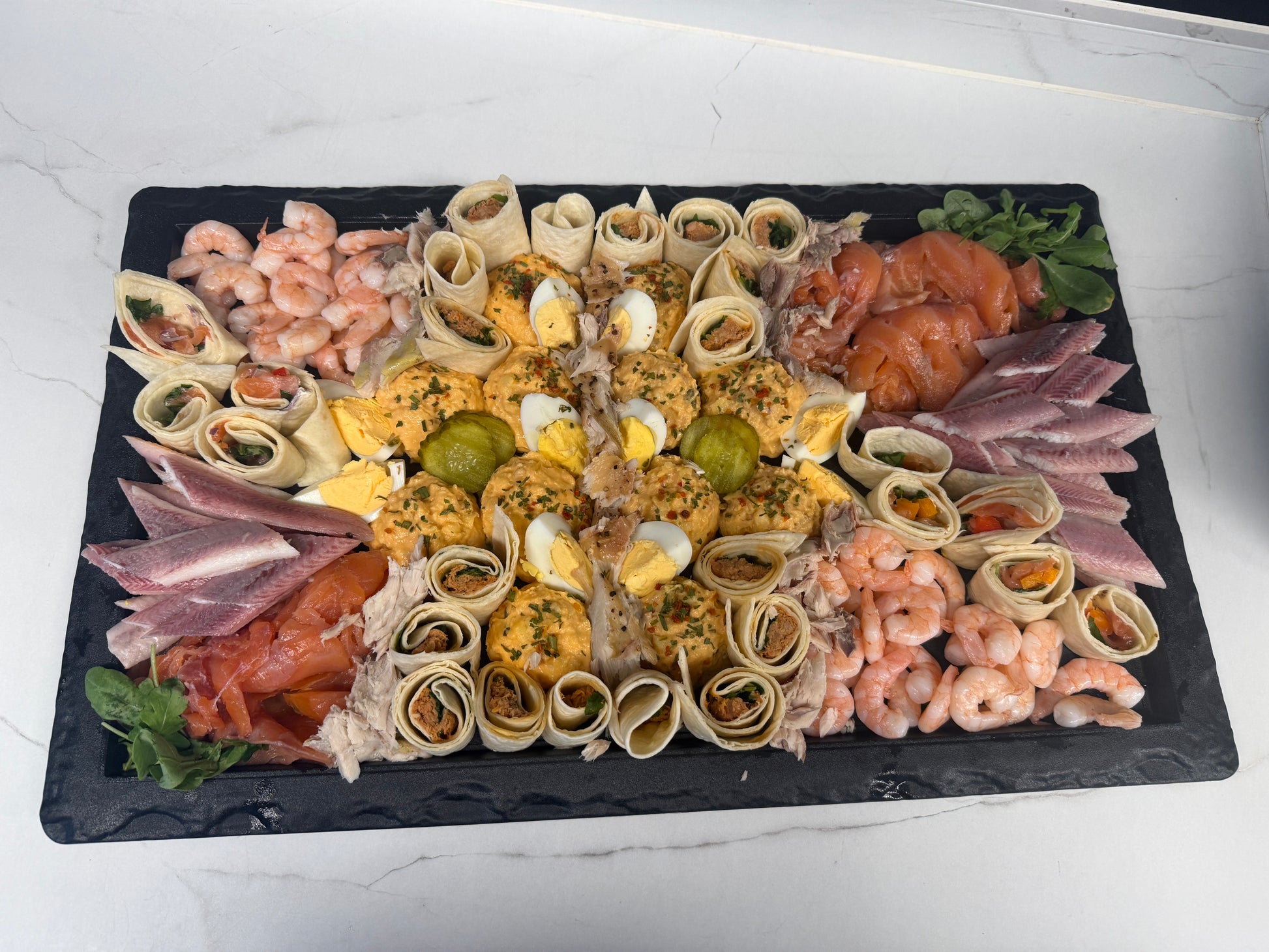 Een feestelijke combinatie van zalm- en tonijnsalade, rijkelijk gegarneerd met gerookte zalm, paling, Noorse garnalen en makreel.