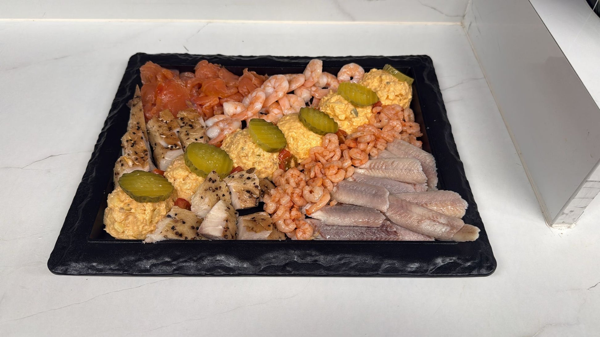 Een feestelijke combinatie van zalm- en tonijnsalade, rijkelijk gegarneerd met gerookte zalm, paling, Noorse garnalen en makreel.